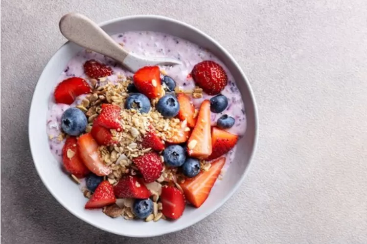 Yogurt Yunani rendah lemak dicampur dengan potongan buah-buahan segar seperti stroberi, blueberry, dan potongan pisang. Tambahkan sedikit madu untuk rasa manis alami.